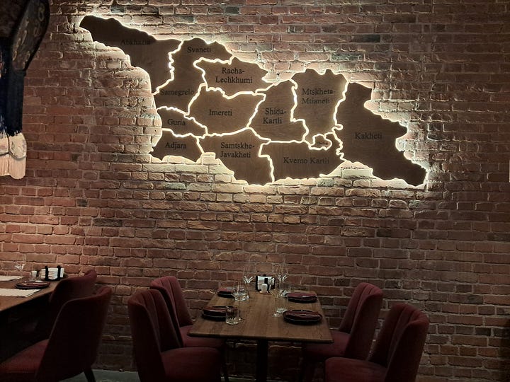 The pleasures of Georgian cuisine are also catching on in Poland. On a recent trip to Warsaw, I couldn’t stop running across Georgian restaurants in the city. My AirBnb was next door to the upscale Genatsvale, where I had a glass of wine underneath a chic black-light map of Georgia. Next day, I stumbled across the hole-in-the-wall Tiflisi Bakery offering to-go portions of sumptuous Georgian lavash bread.